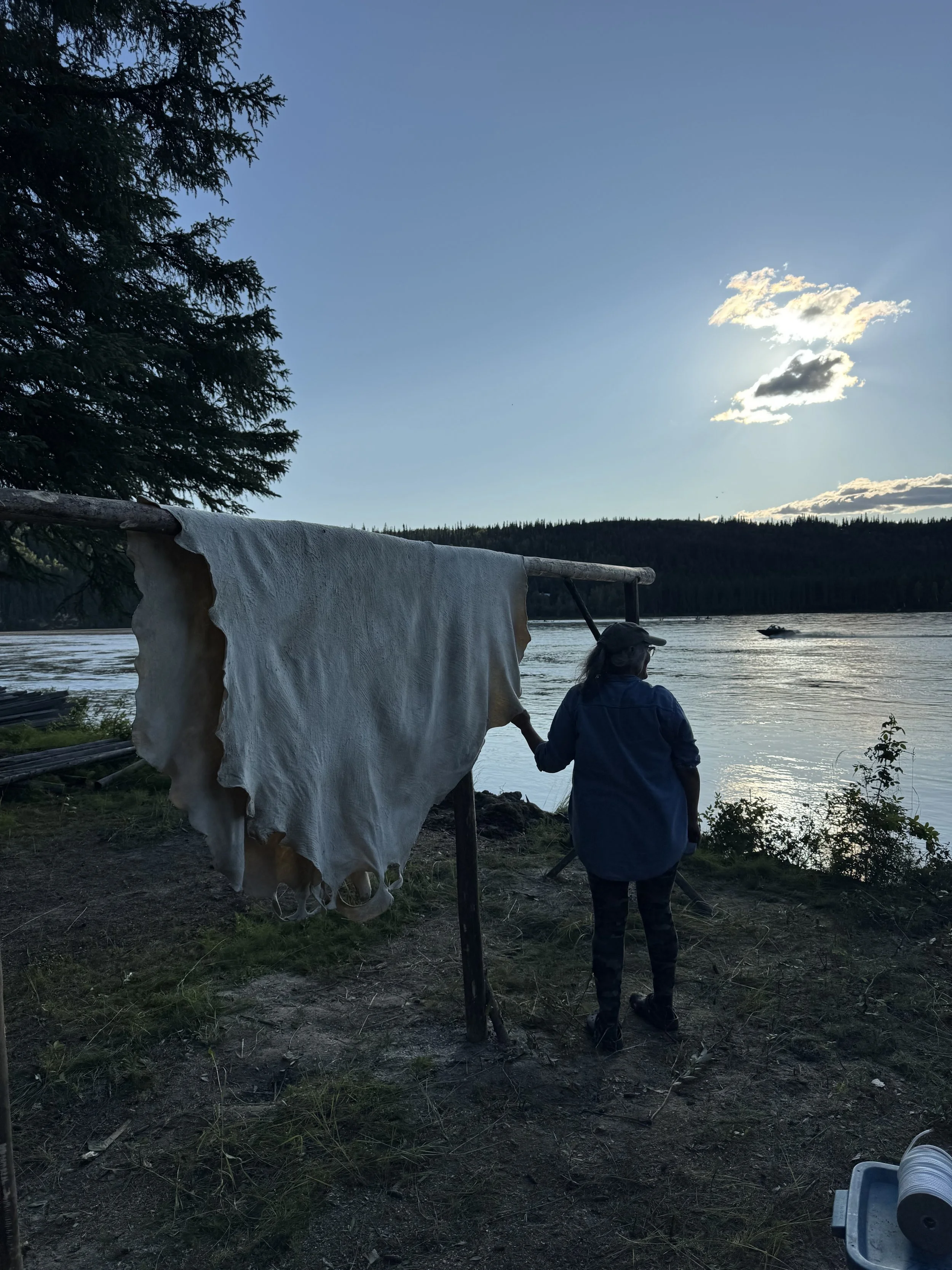 We teach people throughout the year, either in her backyard or we can be requested to go to your community. In September we are accepting donations hide donations during the hunting season of the Interior, therefore this is the only month we are not able to travel. We generally teach hide work in 2-3 camps. The first camp is defleshing and dehairing the hide, afterwards it can be dried or stored. In the winter we put the hides on frames to frost scrape. The following camp is learning how to make the brain solution, letting the hide marinate in the brain solution, and softening the hide afterwards. Weather permitting-or with the right infrastructure-we smoke the hide. Kathleen is able to teach classes on how to make hide regalia. Hide work is sensitive to weather, but still is flexible and forgiving. Reach out if you’d like to learn or host a camp.